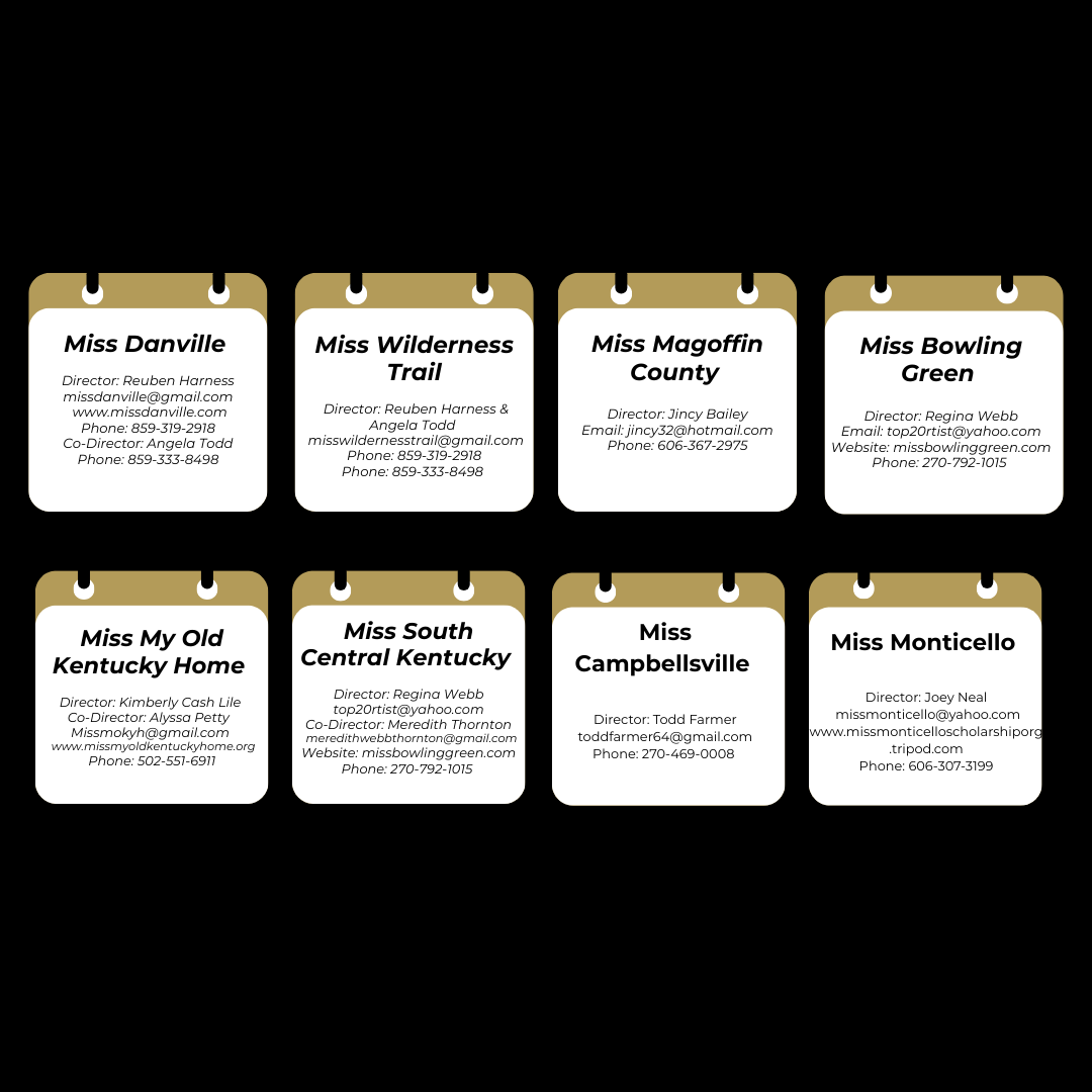 _________________________Interested fair & festival pageant directors should contact the state organization at brian+misskentucky+org .