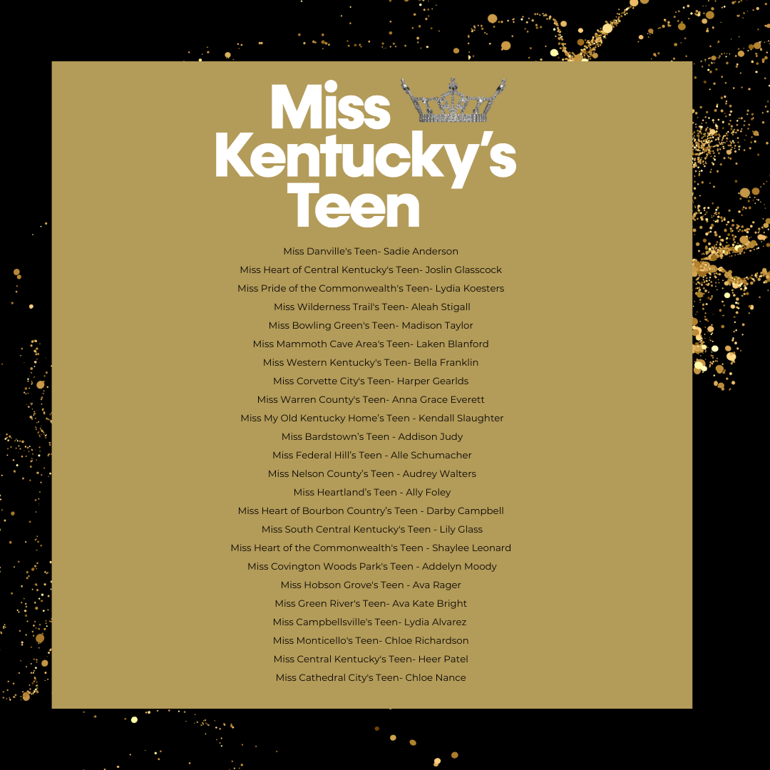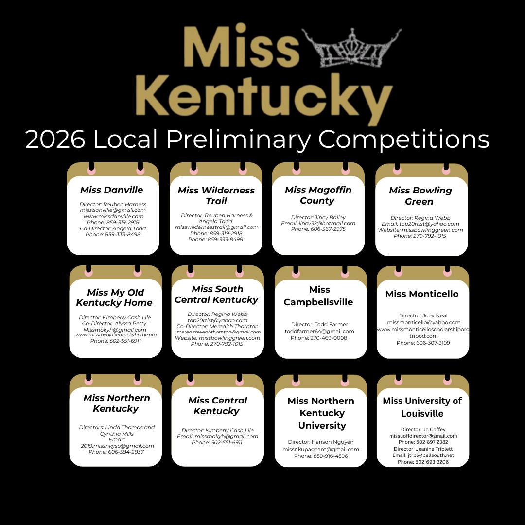 Here is where you can take the first step to becoming Miss Kentucky or Miss Kentucky's Teen. Enter one of the local scholarship competitions held throughout the year across the state for your chance to compete at the state competition.